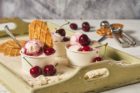 Een compositie van Kersen, kersensorbetijs, froisses, warme steranijshoning, bean blossom en kersenlikeur
